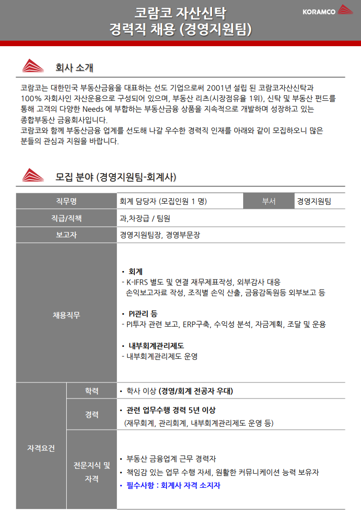 [코람코자산신탁] 경영지원 회계사 채용 (~2/11)