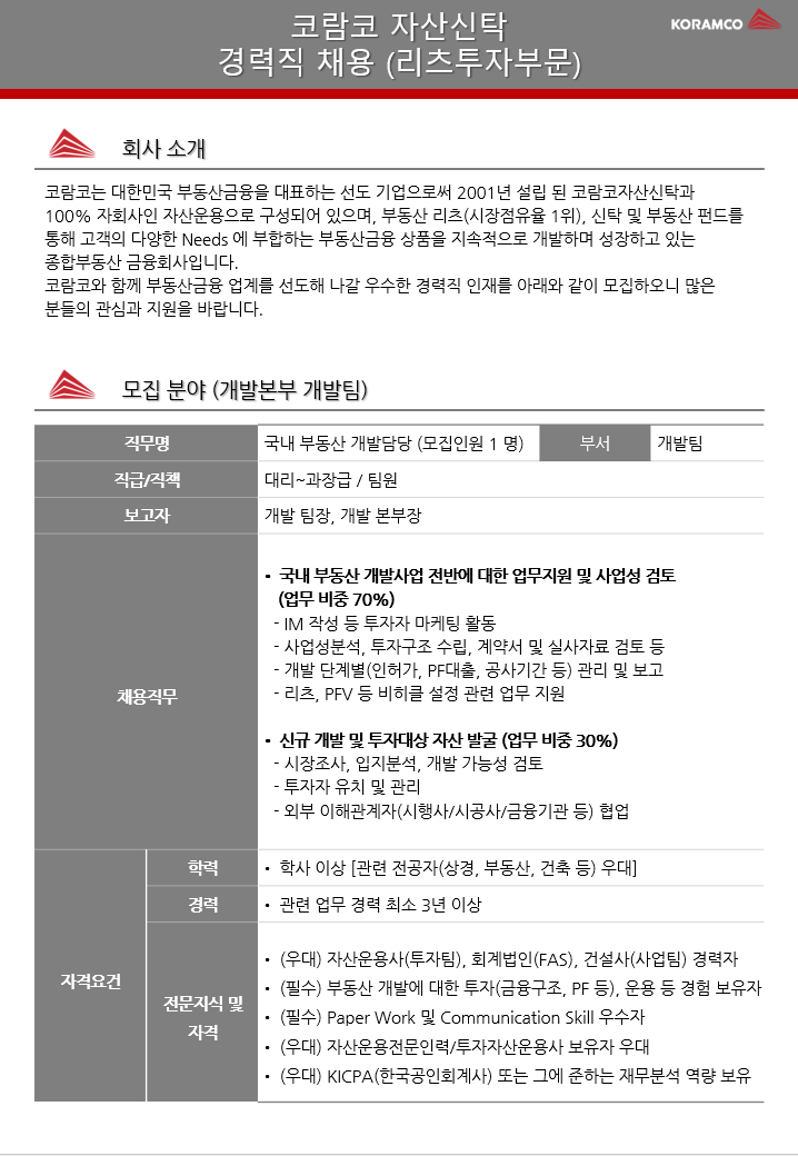 [코람코자산신탁] 리츠투자부문 개발본부 경력직 채용(~2/22)