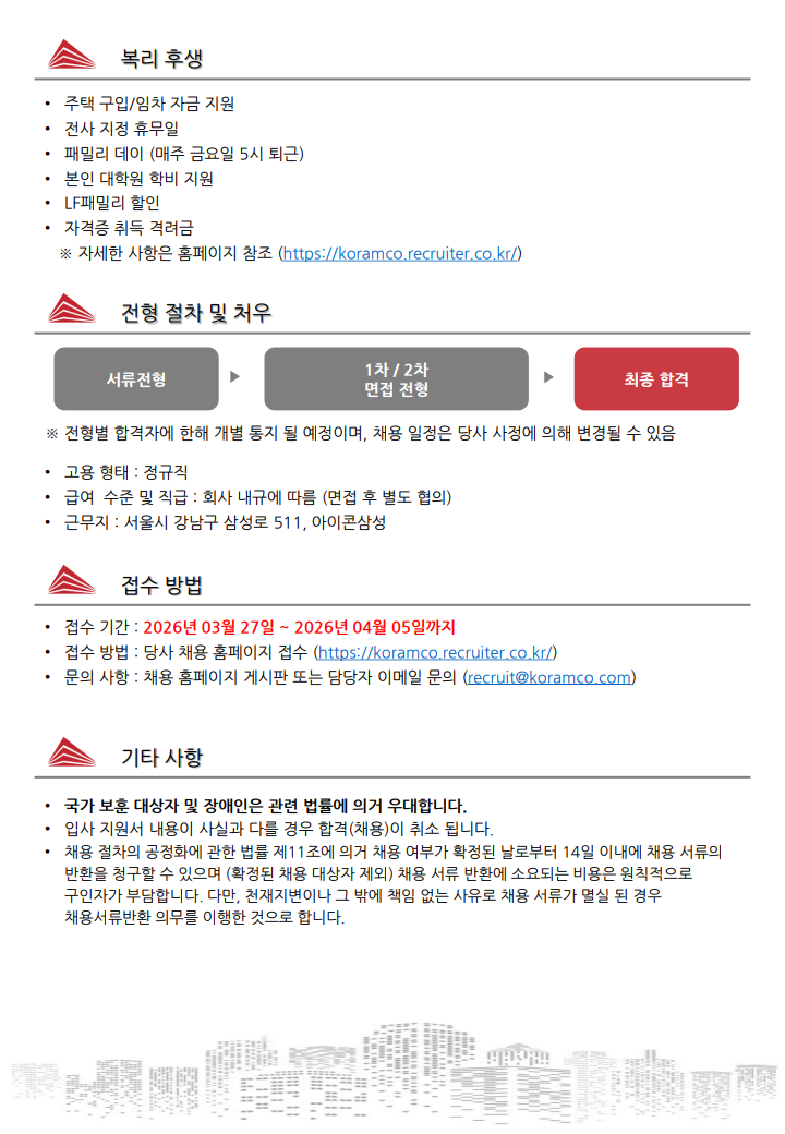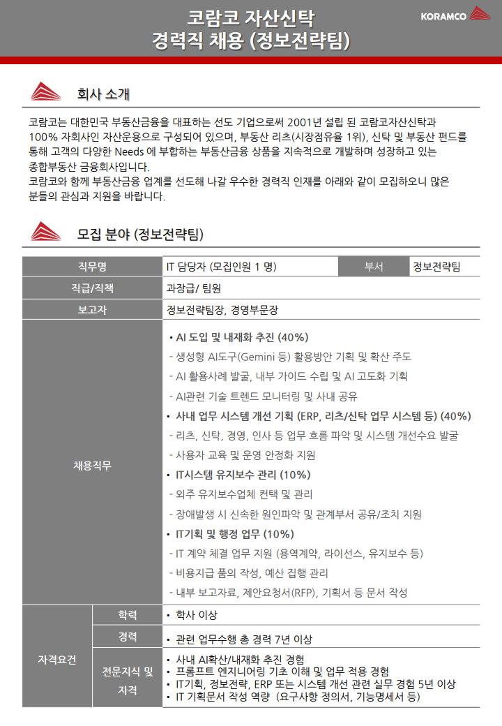 [코람코자산신탁] 정보전략팀(IT담당) 경력직 채용 (~4/5)