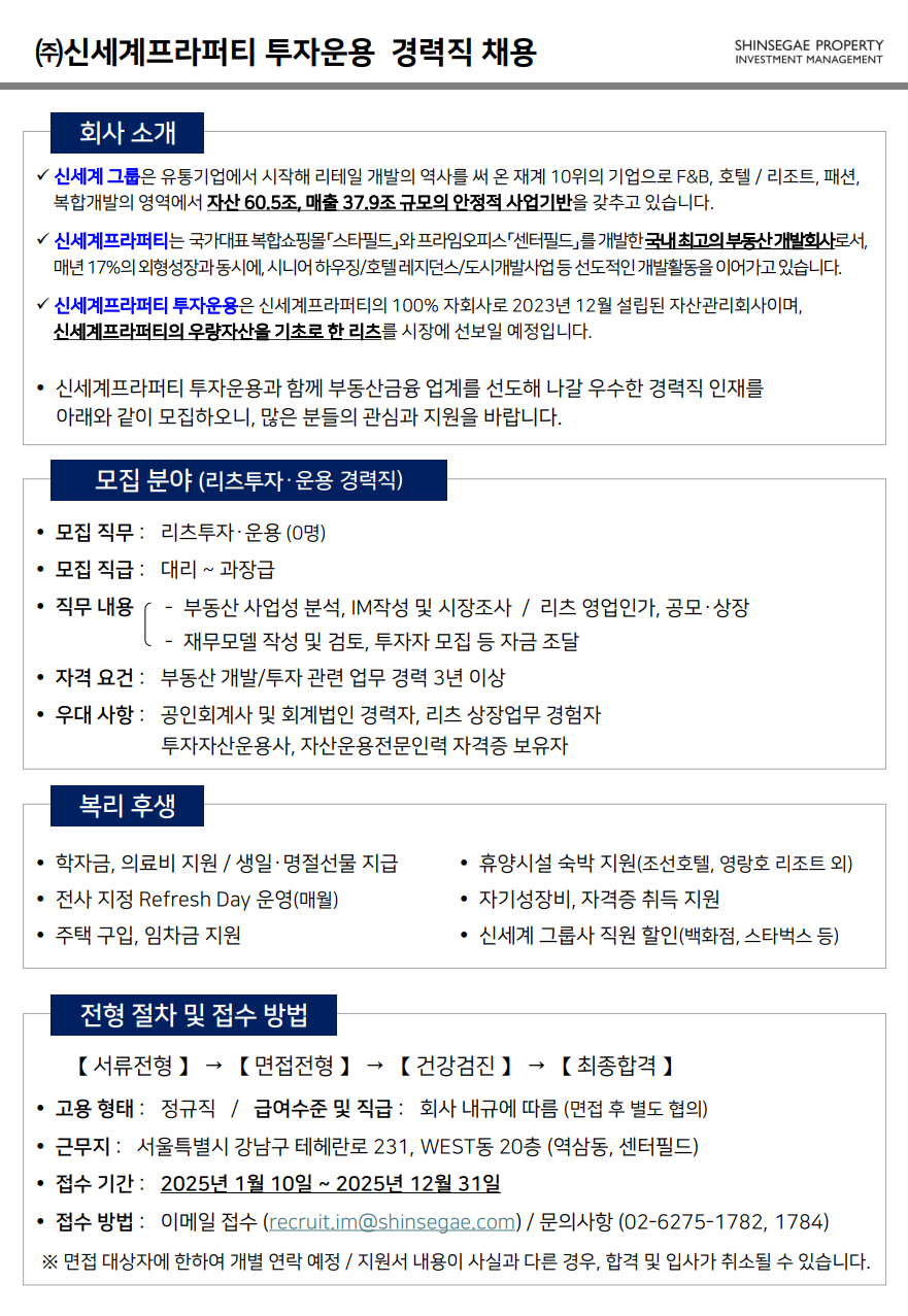 [신세계프라퍼티투자운용] 리츠투자 · 운용 경력직 상시채용