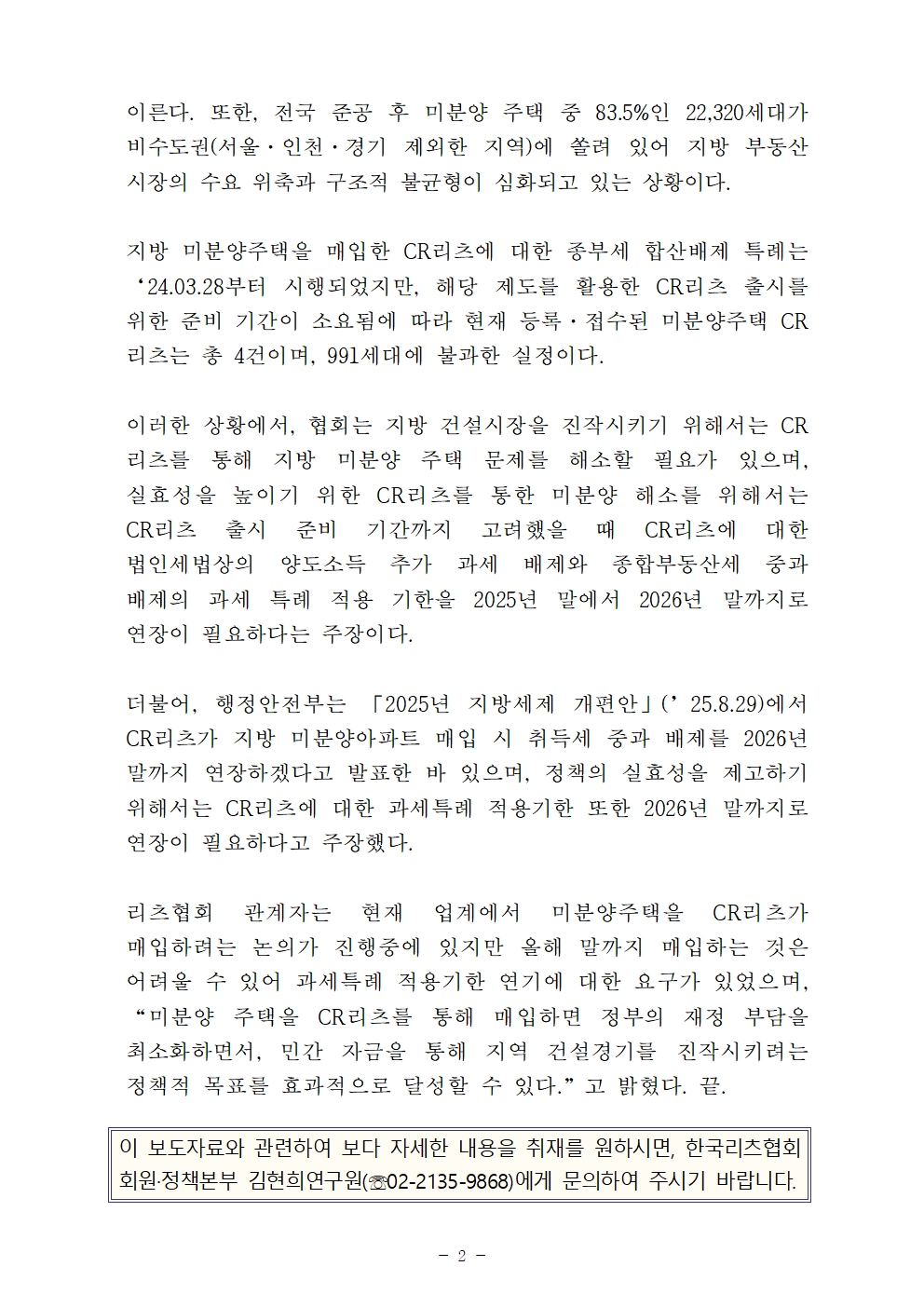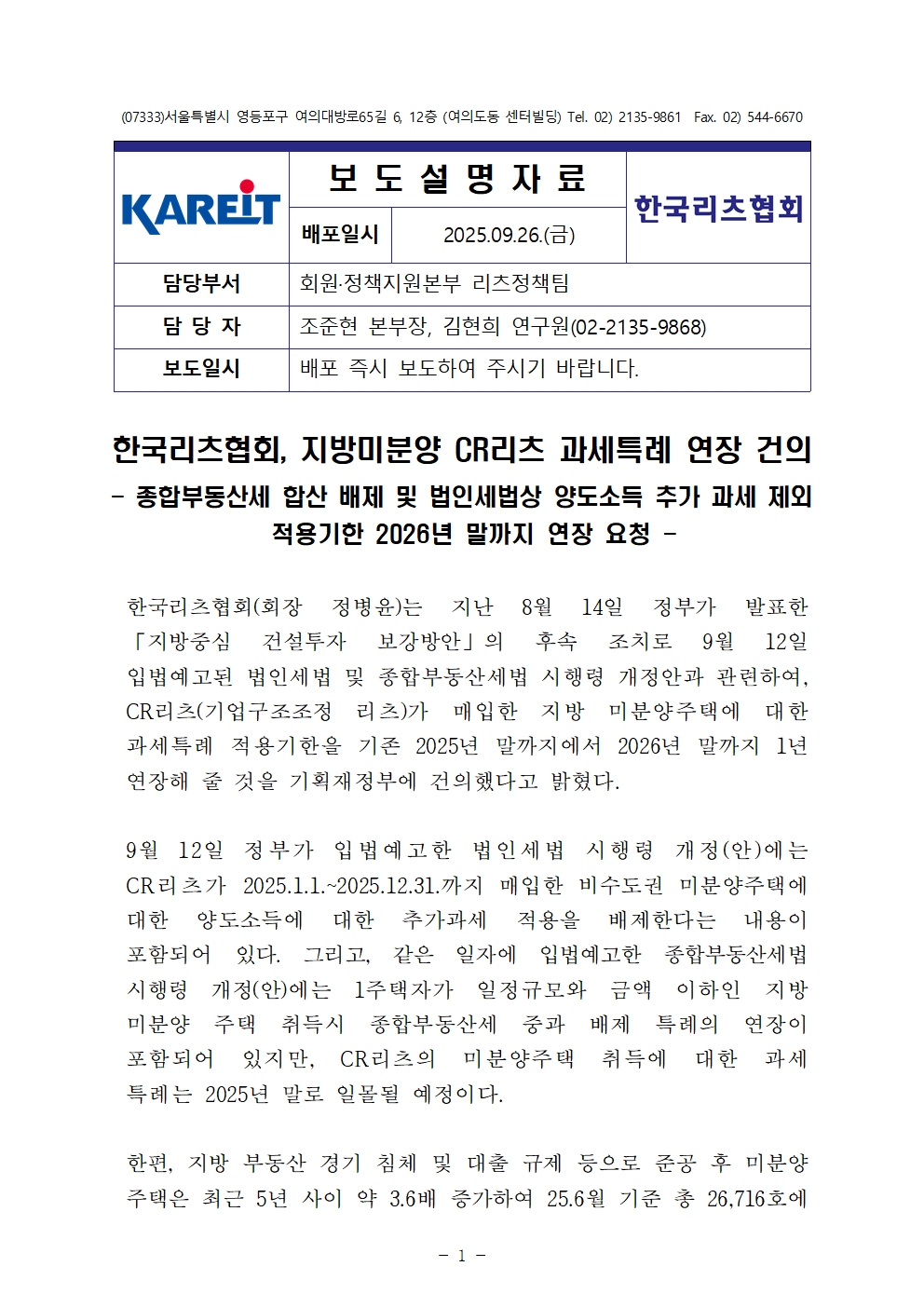 2025.09.26.-[보도자료] 한국리츠협회, 지방 미분양 CR리츠 과세특례 연장 건의_Fin.pdf (178.6 KB)