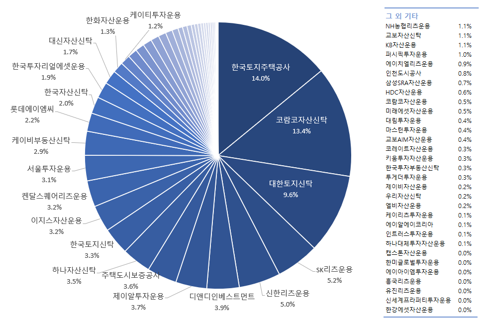 | 코람코자산신탁 | 44 | 15,853.7 | 13.5% |