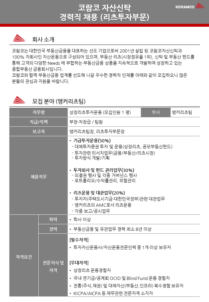 [코람코자산신탁] 리츠투자부문 앵커리츠팀 경력직 채용(~9/21)