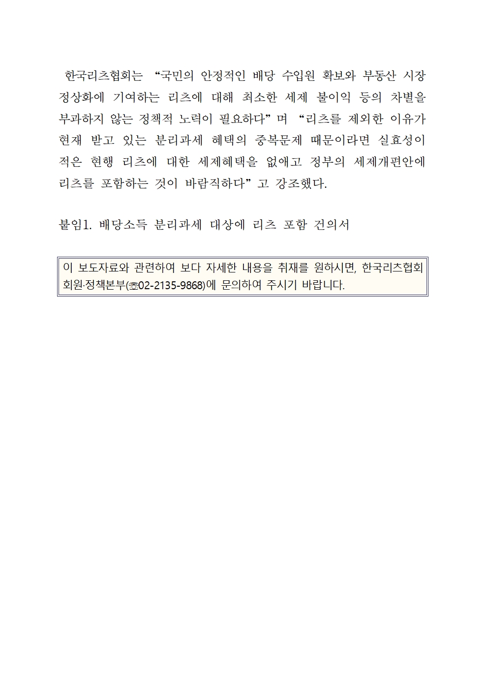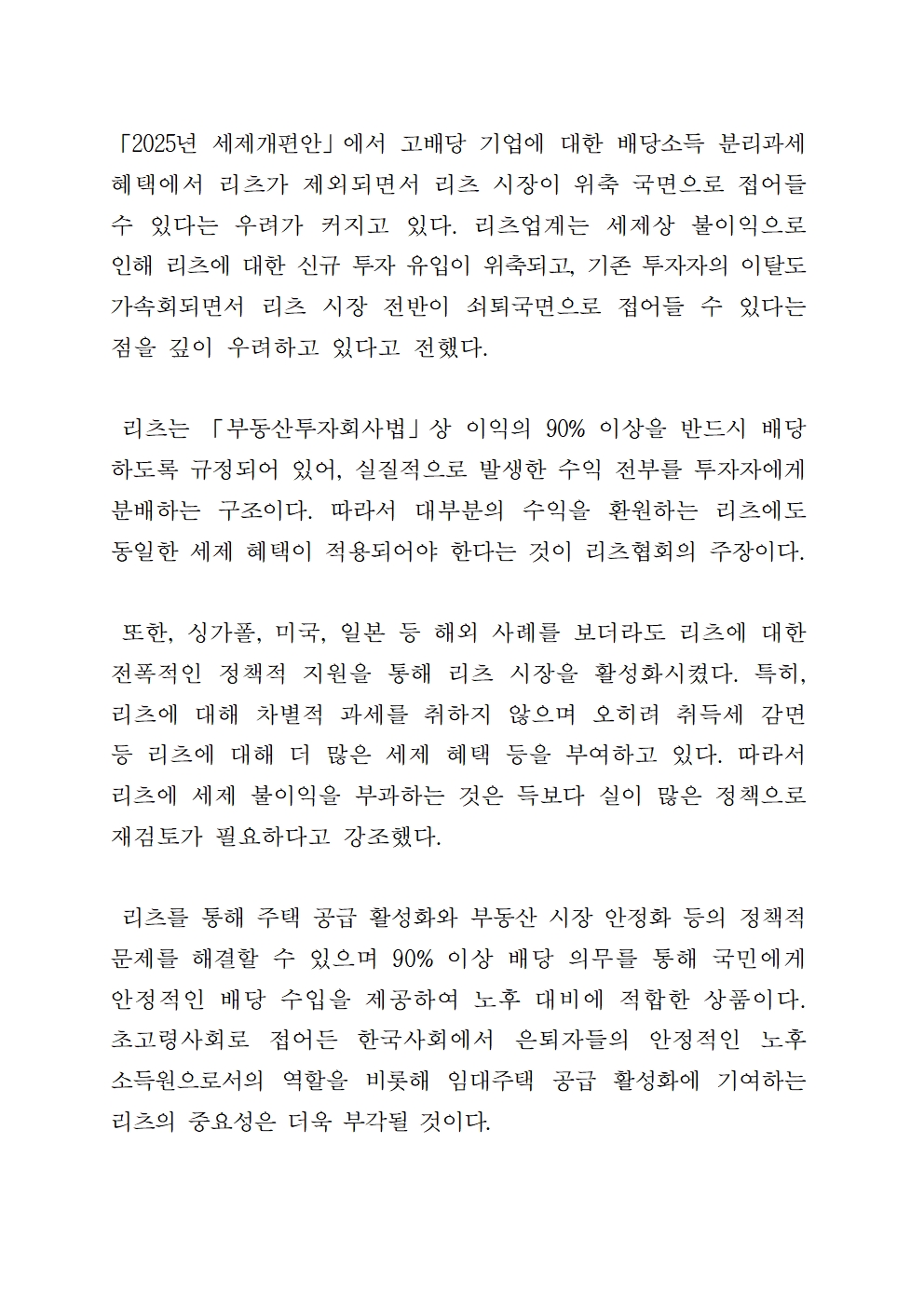 2025.8.5-[보도자료] 한국리츠협회, 고배당기업에 대한 배당소득 분리과세 적용 대상에 리츠 포함 건의.pdf (173.6 KB)