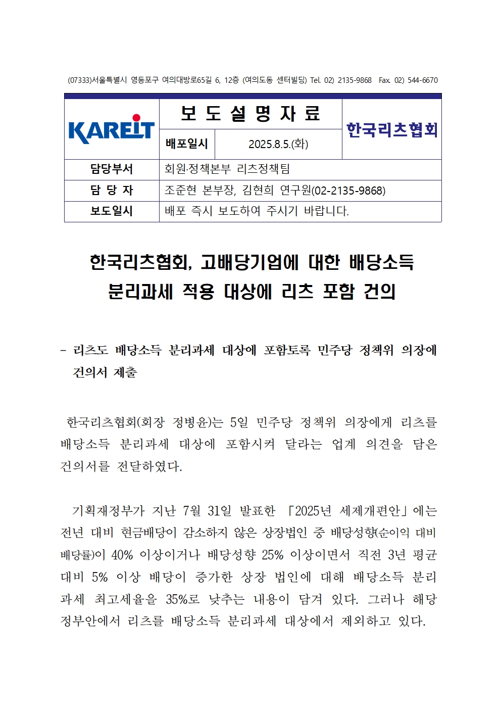 (2025-08-05) 한국리츠협회, 고배당기업에 대한 배당소득 분리과세 적용 대상에 리츠 포함 건의