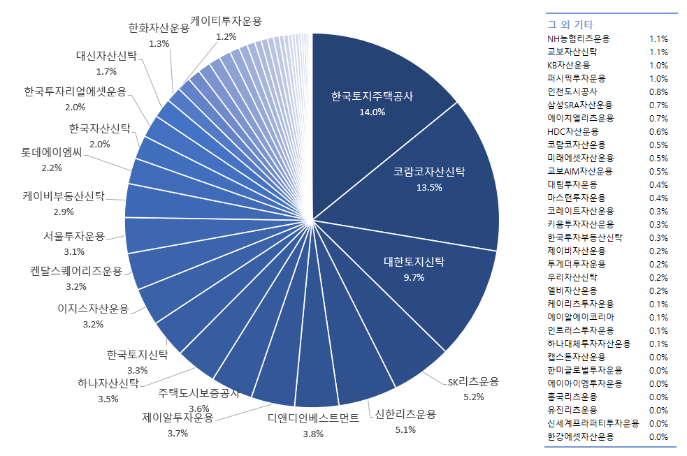 | 코람코자산신탁 | 44 | 15,843.8 | 13.5% |